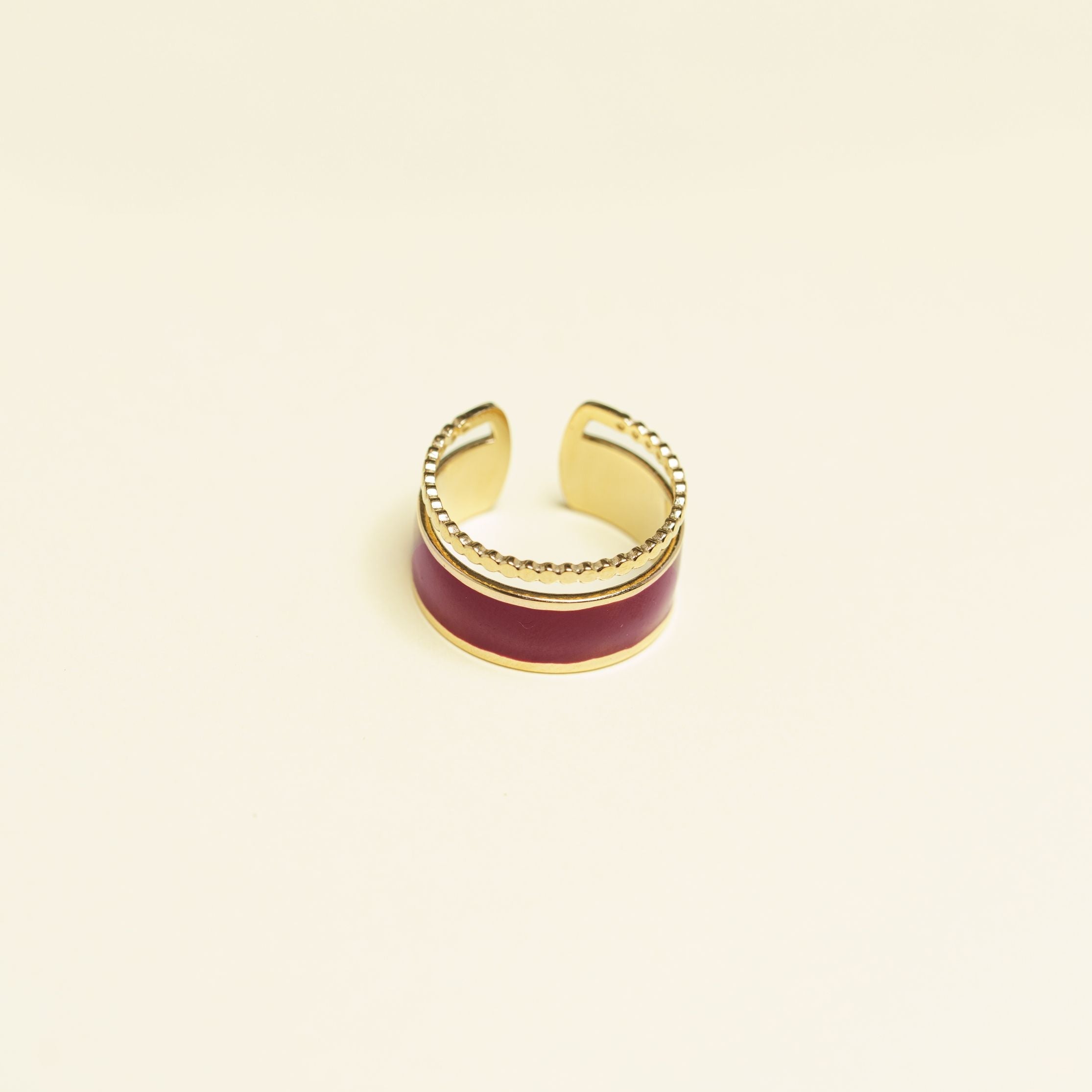 Bague ajustable en acier inoxydable doré à l'or fin. Avec des finitions colorées émaillées.